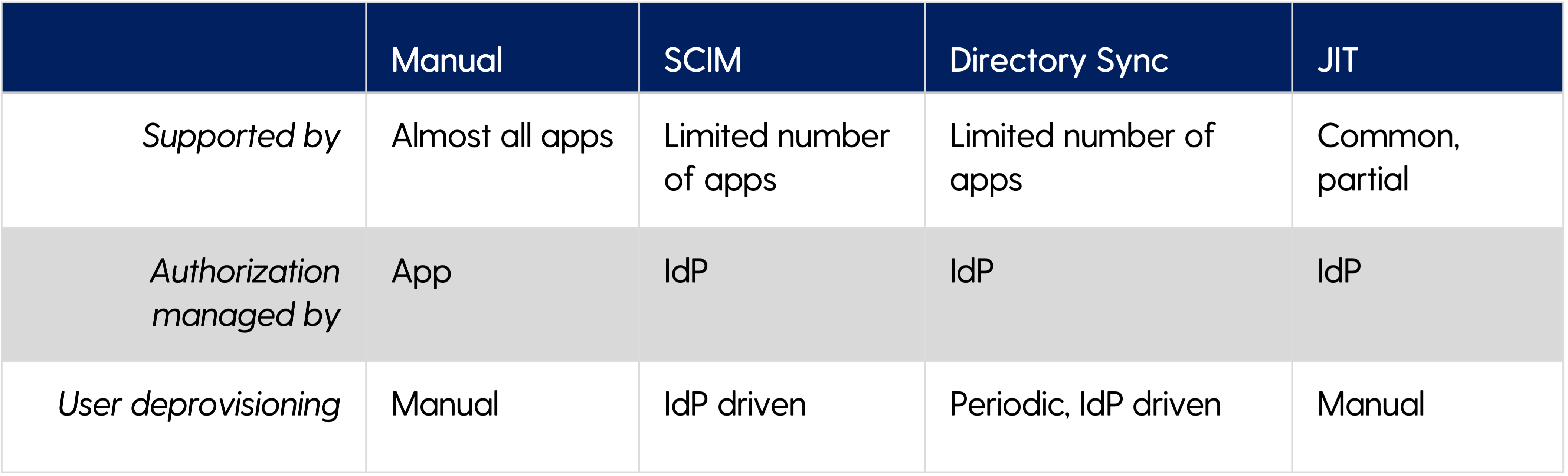SCIM. An Identity Provider (IdP) issues commands instructing apps to create and destroy users when users join or leave the organization, or when their permissions change.