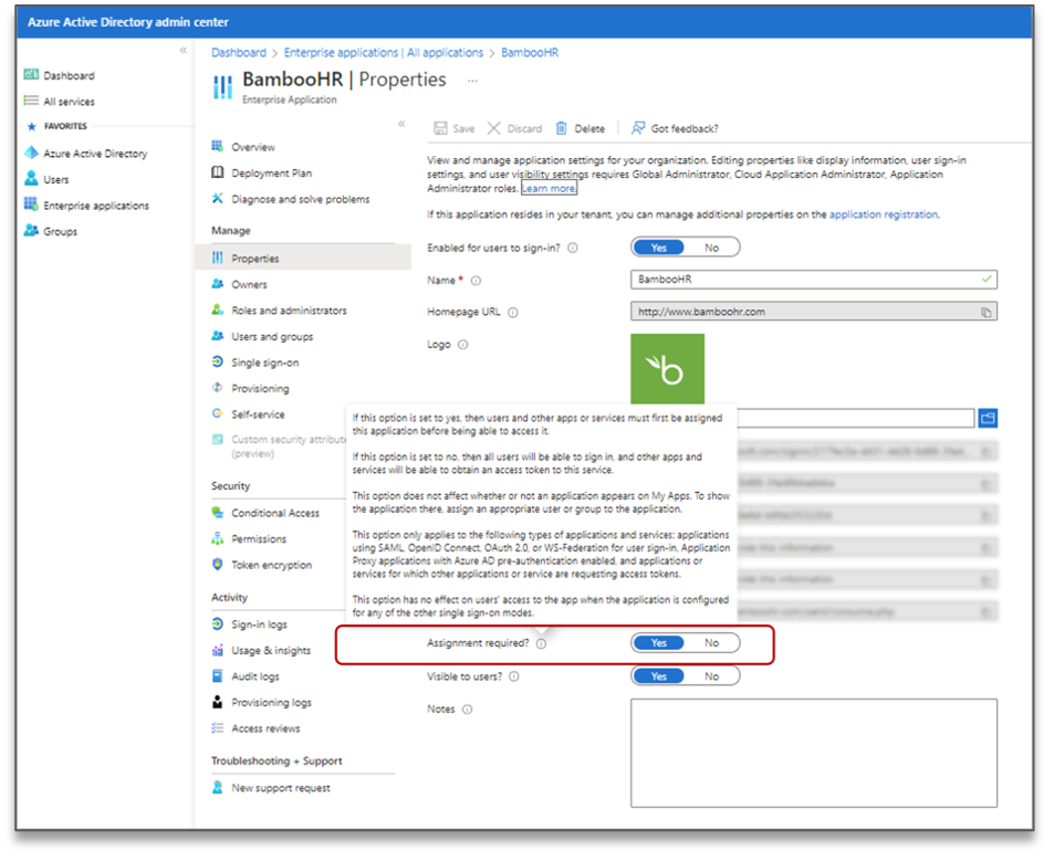 Azure AD supports two assignment configuration options for each SaaS service connected to SSO. The configuration is named “App Role Assignment Required.” When this configuration is turned on, Azure AD will only authorize identities that have been explicitly assigned to an app to login to that application. When this configuration is turned off, Azure AD will only perform authentication, and will allow any user within that Azure AD tenant to login to that application.